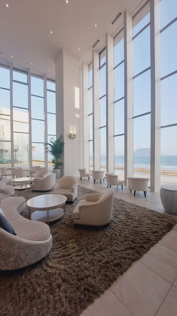 エントランスに入り、ロビーからも目の前に広がる唐津湾が一望できました。