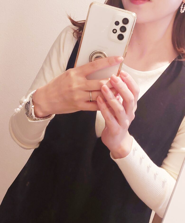 パールアクセサリーを付けることも多いので合わせやすいです。私はオフホワイトのクルーネックにしました。